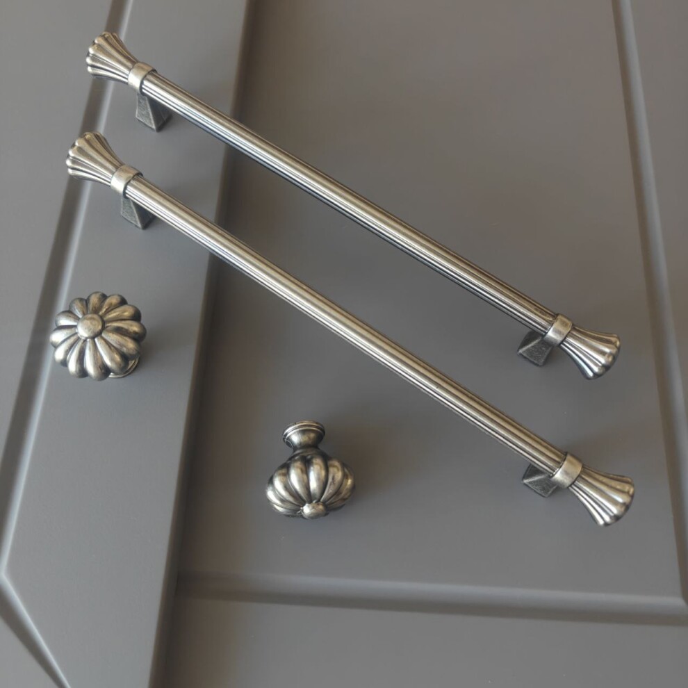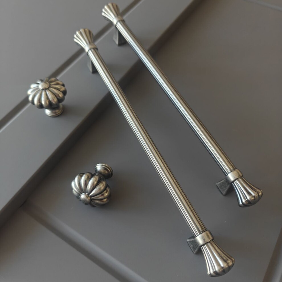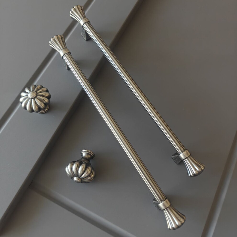 Выразительная мебельная ручка скоба с окончаниями, напоминающими цветочный бутон.
