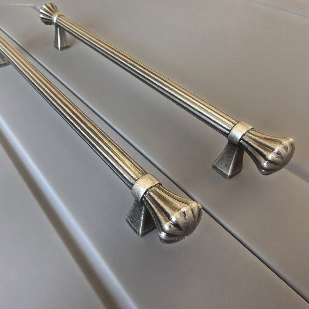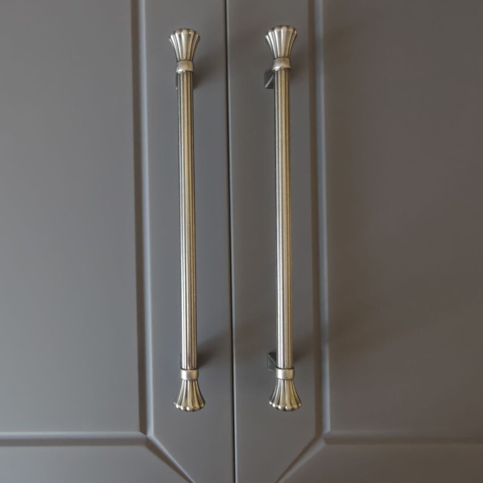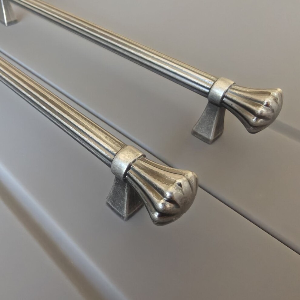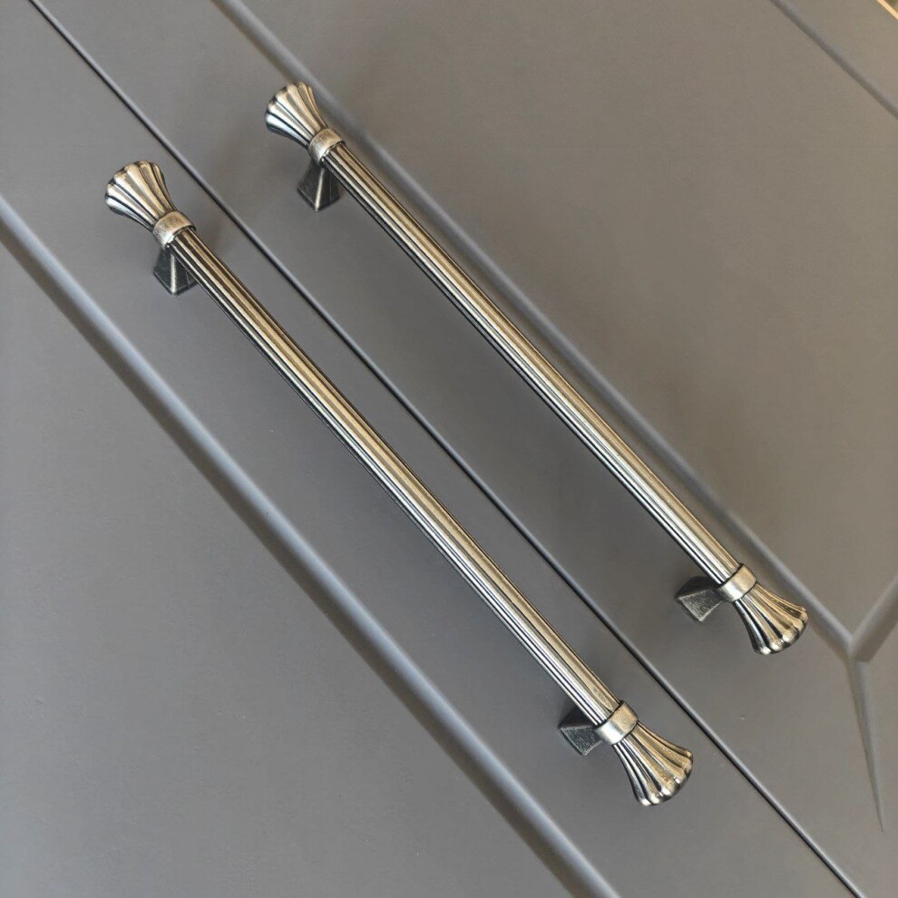 Выразительная мебельная ручка скоба с окончаниями, напоминающими цветочный бутон.