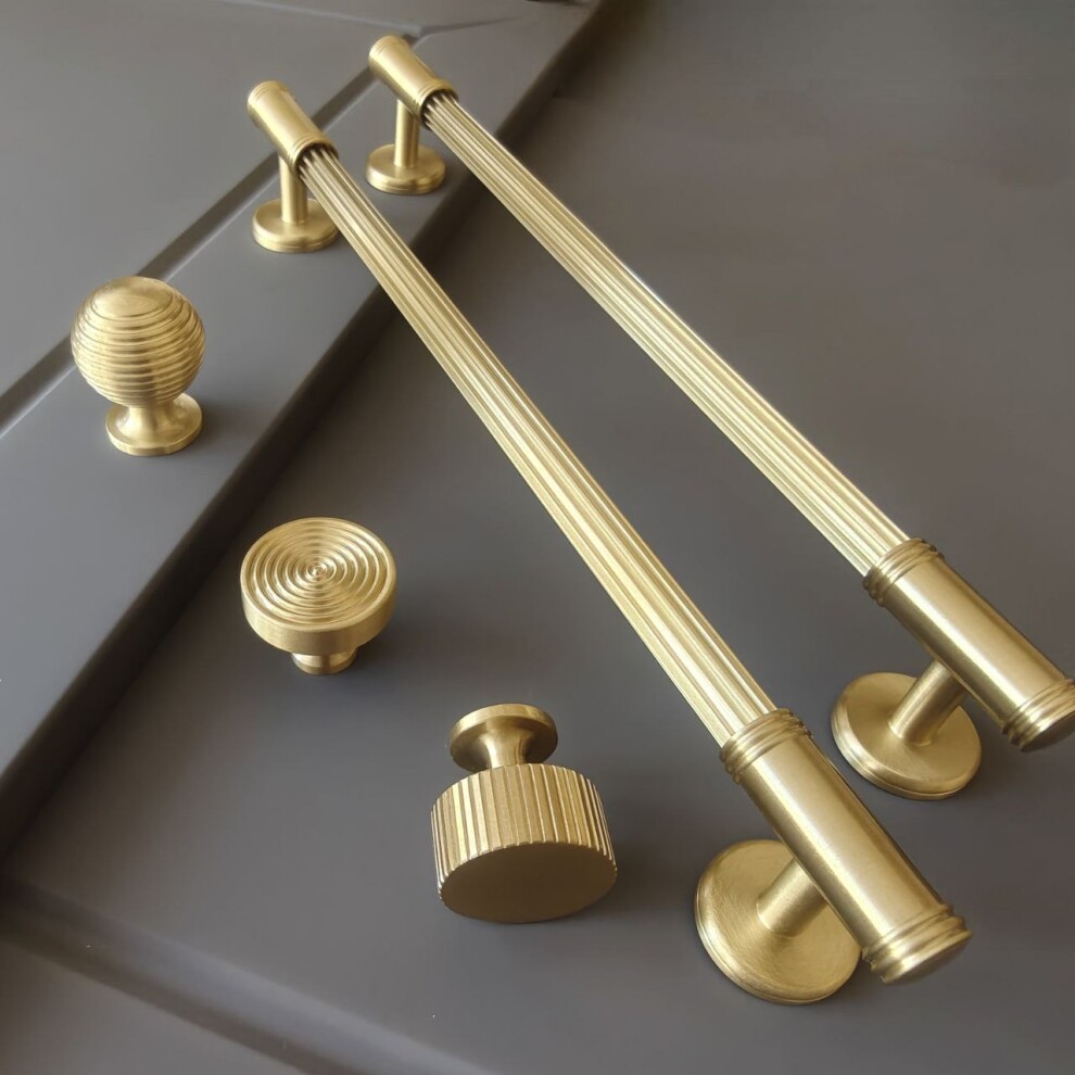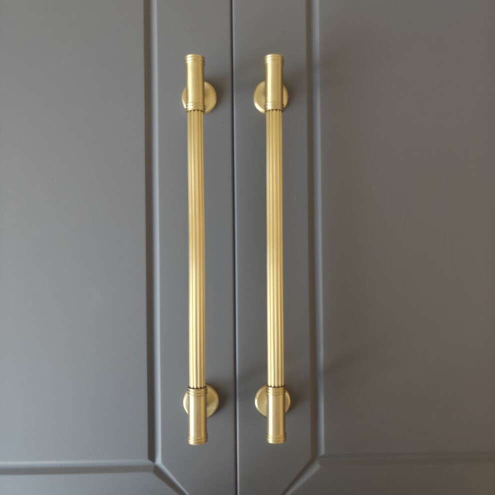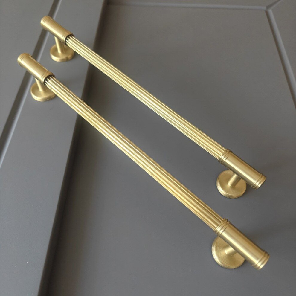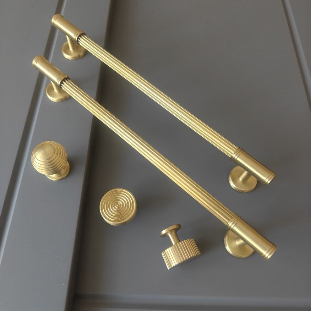Ручка скоба в матовой латуни, сочетание гладких и рельефных элементов