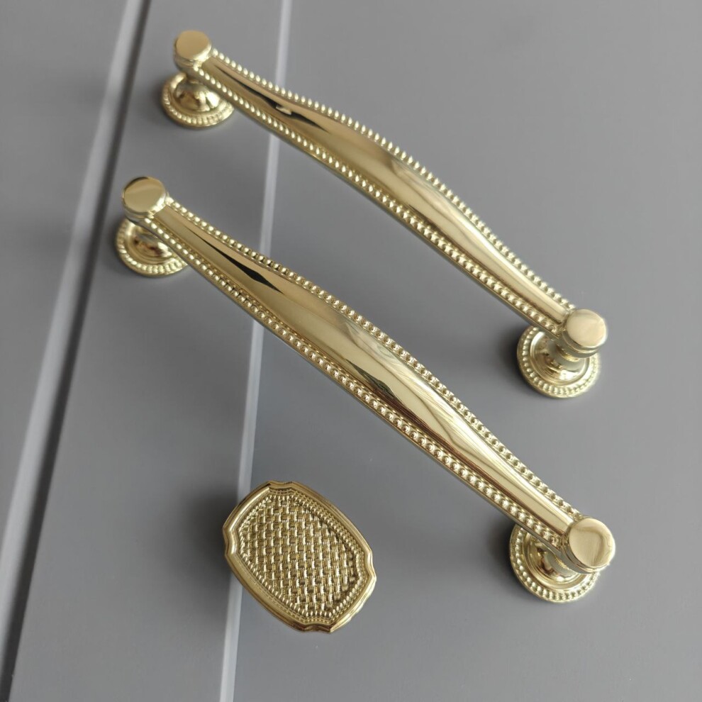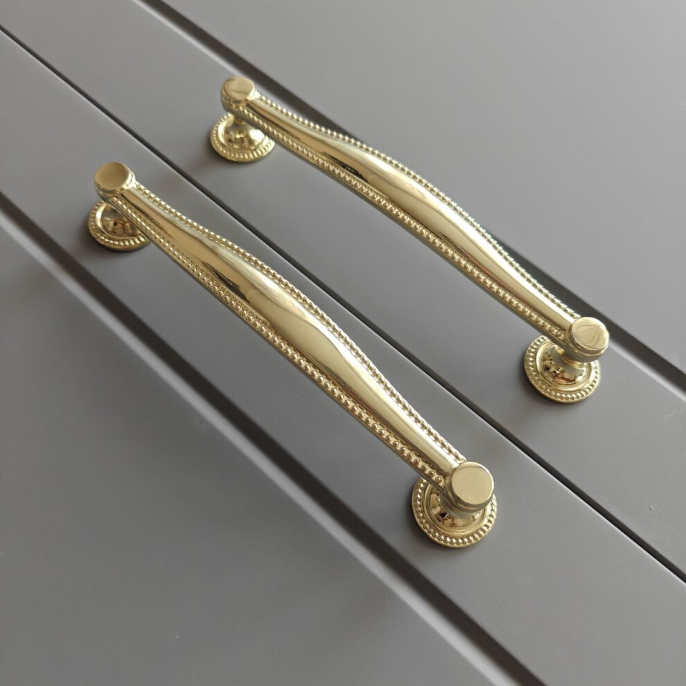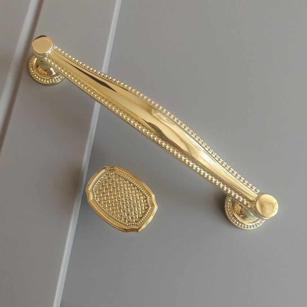 скоба с плавным изгибом и ненавязчивым декором, с красивыми основаниями и благородным мерцанием глянцевой латуни.