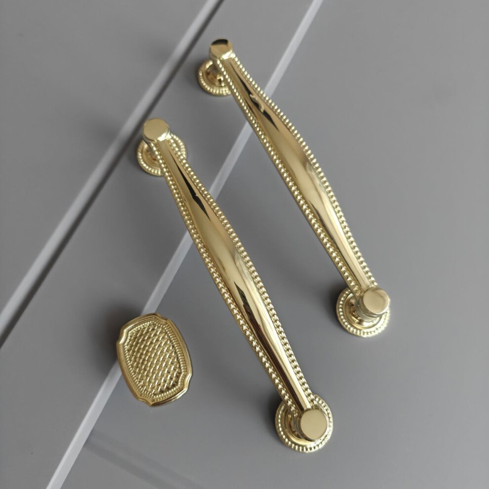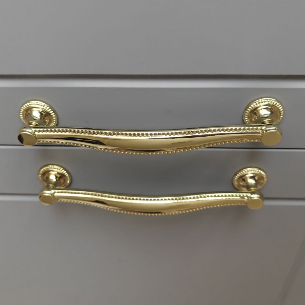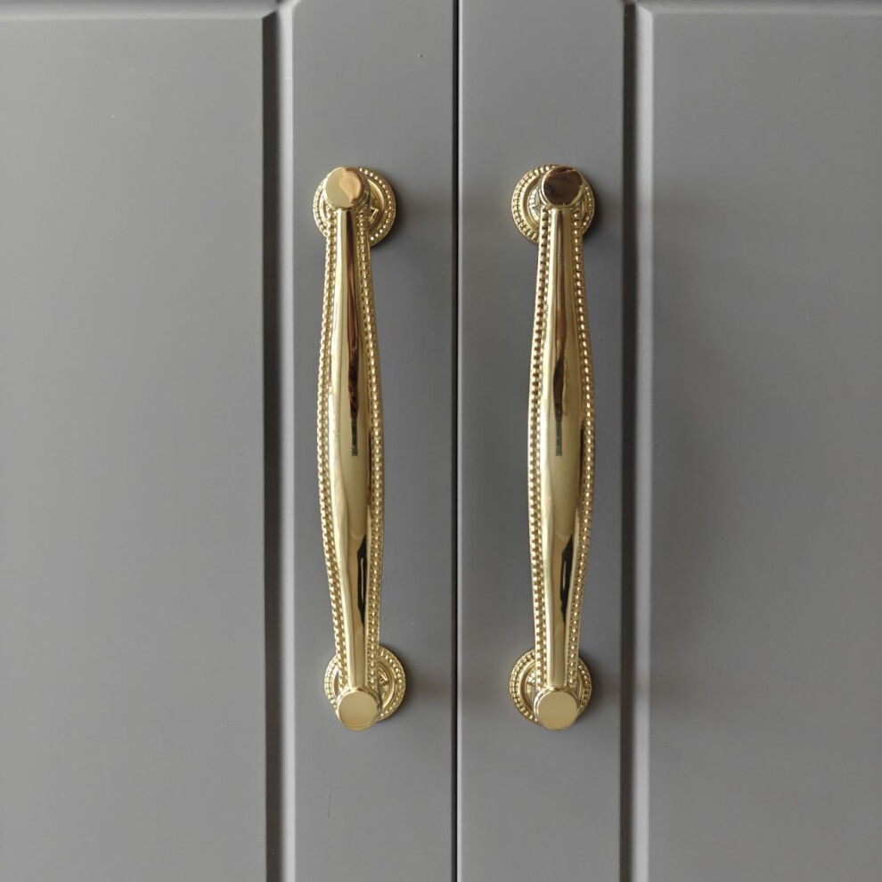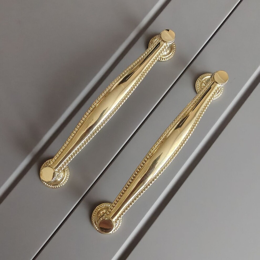 скоба с плавным изгибом и ненавязчивым декором, с красивыми основаниями и благородным мерцанием глянцевой латуни.