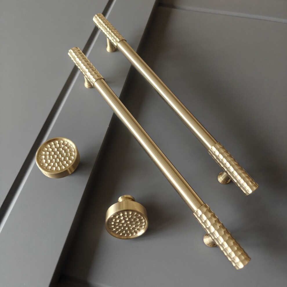 Гармонично дополняются скобами с идентичной фактурой или наоборот, простыми скобами для придания фокуса на неординарность кнобов.