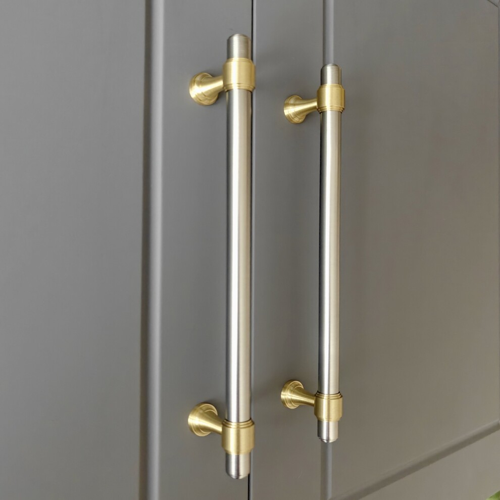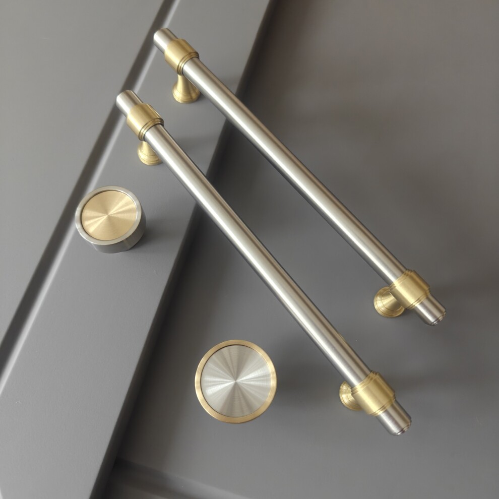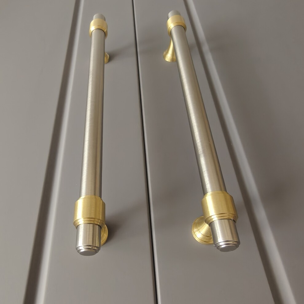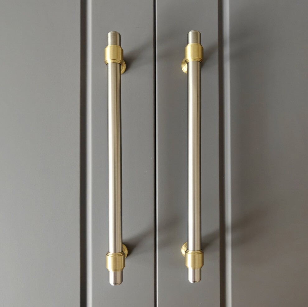 Идеальное сочетание матового никеля в обрамлении матовой латуни. Обратите внимание на фигурные торцы и сложные основания, в этом отдельный изыск этих ручек.
